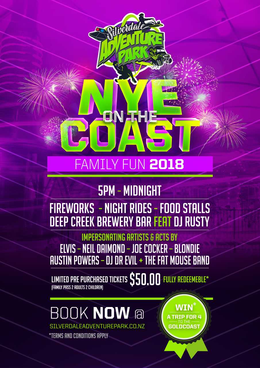 Welcome to the inaugural New Years Eve on the Coast event hosted by Silverdale Adventure Park. NYE on the Coast was created to fill the void for families who would like to celebrate in a festival environment that caters for adults and their children. The fully redeemable ticket option not only makes it affordable to all, it allows families to have fun whilst celebrating the arrival of a new year.